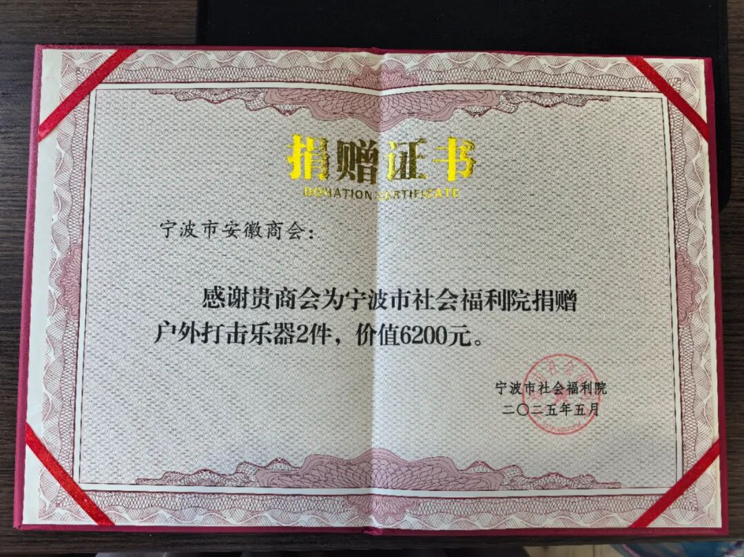 座谈会上,罗勇对我会的善举表达了诚挚的感谢。随后,他详细介绍了党和政府在儿童福利保障方面的政策扶持举措。他表示,儿童福利事业是一项需要全社会共同参与的事业,正是像我会这样的社会力量持续注入爱心,才让这份守护更加坚实有力。他相信,在党和政府的坚实保障下,在社会各界的持续关爱与帮助中,孩子们定能拥抱更加灿烂美好的明天。朱云对福利院优美的环境、完善的硬件设施、科学的管理模式等给予了高度赞扬,对院长和老师们日复一日的悉心照料表达了敬佩之情。孩子们与院长、老师们之间充满爱意的互动,更令他深受触动。他表示,通过罗院长的介绍,深刻感受到国家政策对儿童福利事业的全方位支持。他指出,儿童是社会的未来和希望,此次我们根据福利院需求,带来了一批儿童户外打击乐器,希望能为孩子们的生活增添一些色彩,这些礼物虽不算贵重,但凝聚着商会全体会员的爱心与牵挂。同时,我们也希望通过这次活动,呼吁更多社会力量关注特殊儿童群体,让他们感受到社会大家庭的温暖。此次慰问活动,不仅是宁波市安徽商会党支部践行初心使命、传递社会正能量的生动体现,更是商会履行社会责任、彰显徽商担当的有力见证。未来,宁波市安徽商会将持续关注公益事业,开展更多形式多样的爱心活动,为需要帮助的群体送去更多的温暖和关爱,让新时代徽商精神在宁波这片热土上不断传承与发扬。 捐赠证书
